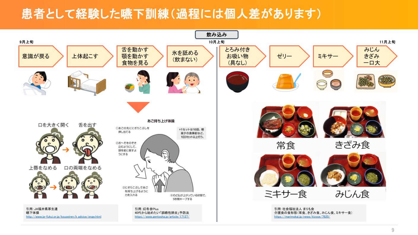 直野氏は海での事故による頸髄損傷の後、約1ヶ月間は意識不明で、意識が戻るやいなや過酷な嚥下訓練が始まりました。